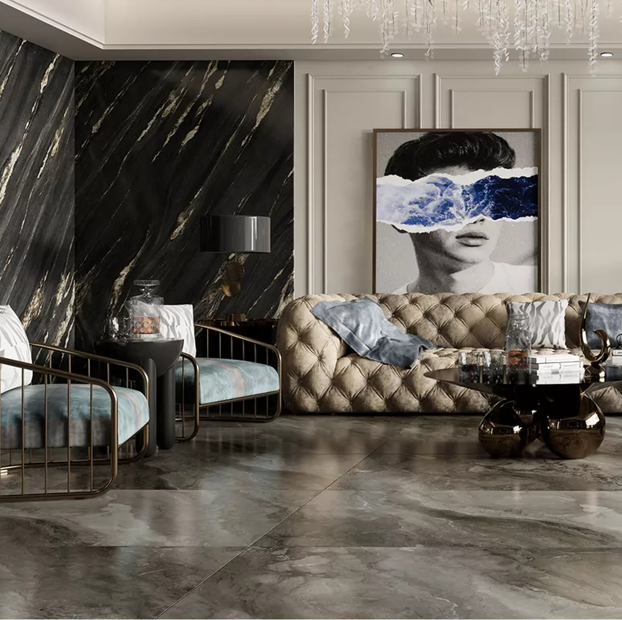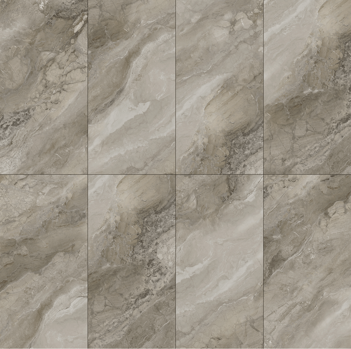 A warm grey-beige marble-look tile with sweeping veining and layered mineral textures. The surface shows noticeable tonal variation, blending soft beige, grey, and subtle brown tones. Its lightly polished finish creates a refined, natural look suitable for feature walls and elegant floor spaces.